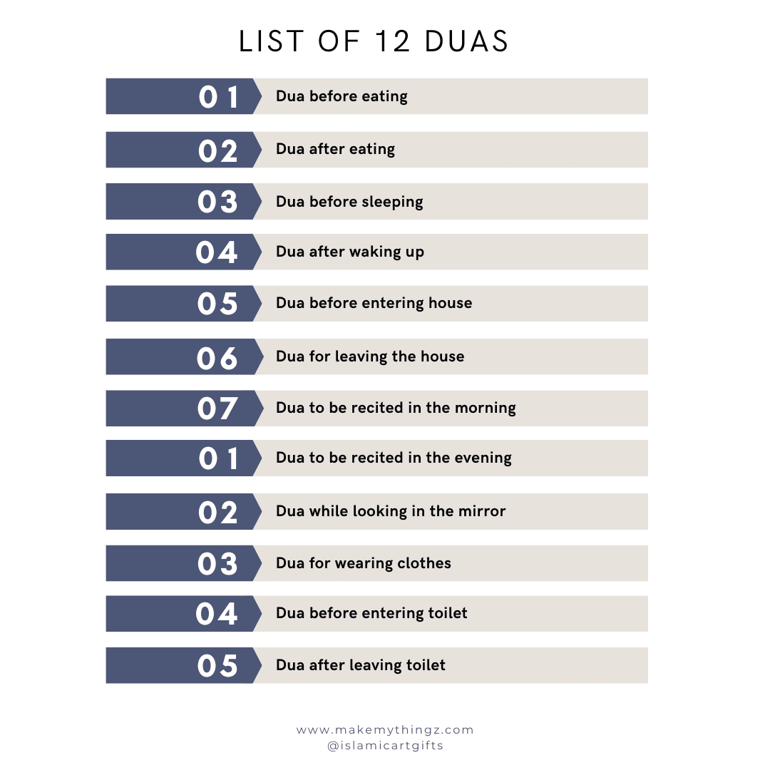 Complete Set of 12 Daily Duas – Covers essential everyday supplications (e.g., waking up, before meals, entering/exiting the home, before sleeping, etc.).