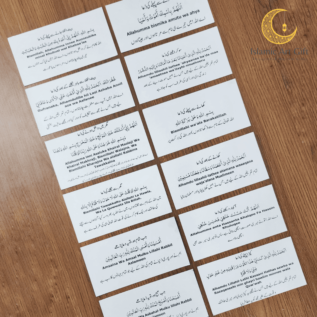 duNever miss your daily supplications again with our Dua Stickers – now with Urdu translation. This set of 12 waterproof, transparent stickers features essential daily duas in Arabic, along with their Urdu meanings for easy understanding.