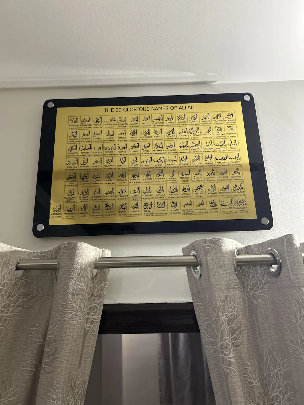 Our Divine and Elegant ASMA UL HUSNA wall art is a perfect way to remind oneself of ALLAH Almighty and HIS blessings on us on a daily basis. All the 99 glorious names of our ALMIGHTY are engraved on the wall art in Arabic as well as Transliterated in English. You can even memorize all the INCREDIBLE 99 names with the help of this wall art.